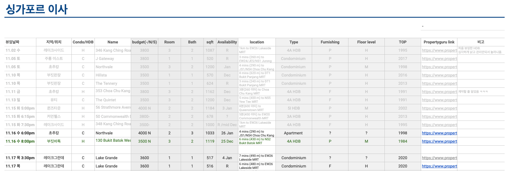 여튼 이 정도의 기준을 가지고 프로퍼티구루(싱가포르의 대표적인 부동산 매물 플랫폼) 서칭을 엄청나게 해댔다.