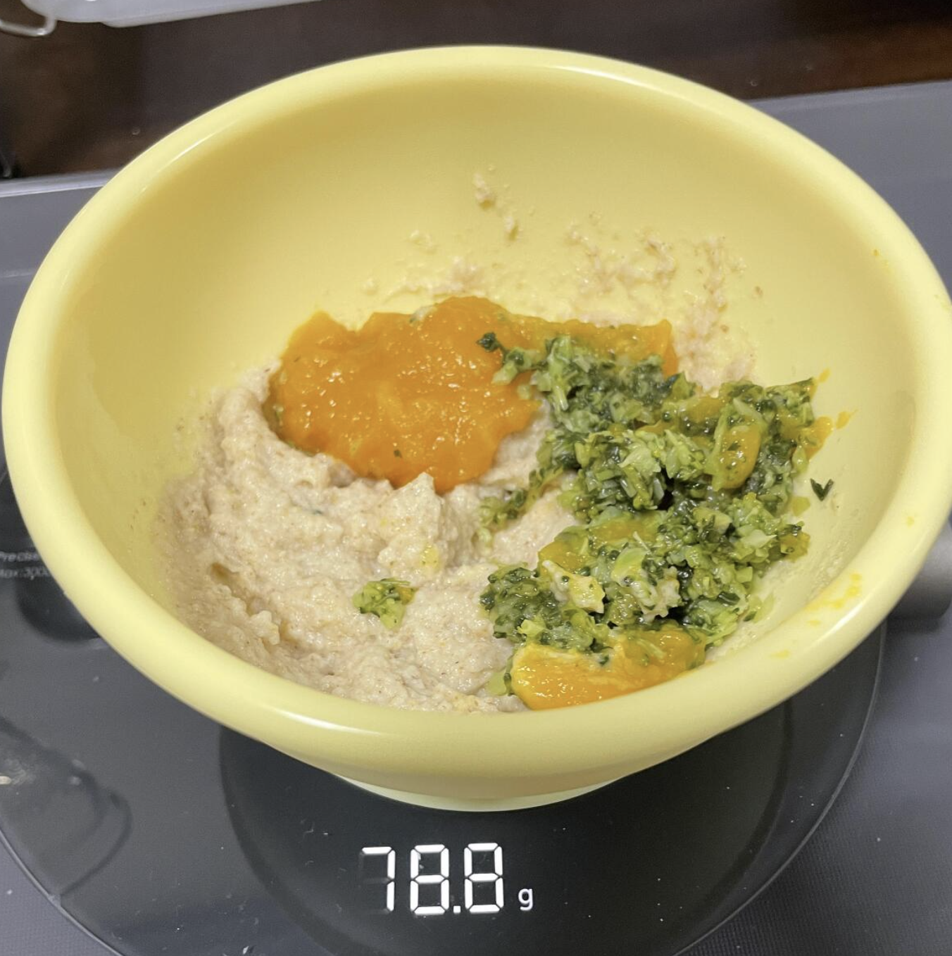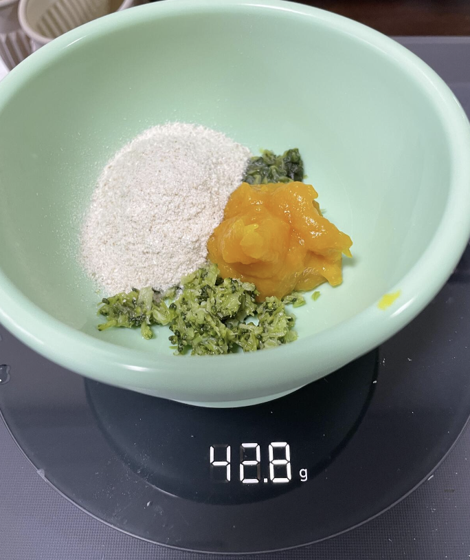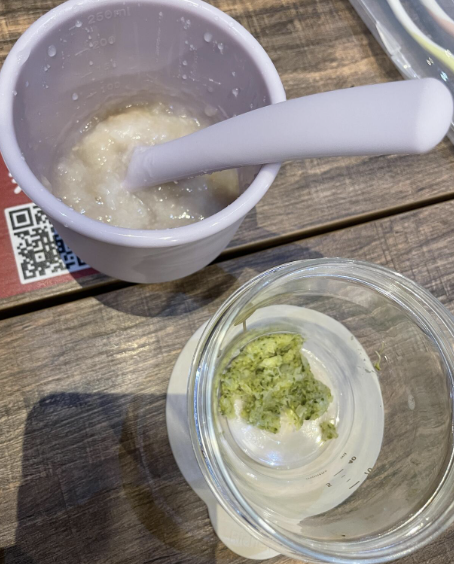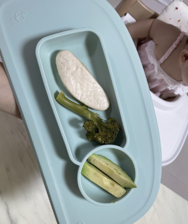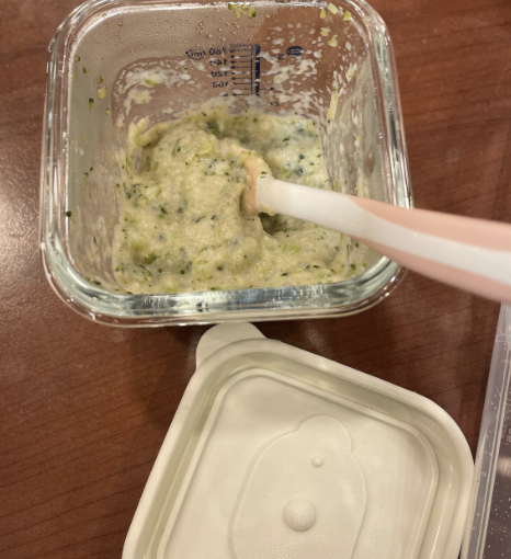 6개월차에는 유축모유와 함께 베이비시리얼을 썼기때문에 불앞에서 오랫동안 서서 저어야하는 일은 없었고 야채나 고기를 굽거나 찌는 정도만 했고 토핑처럼 올리거나 섞어주었다.