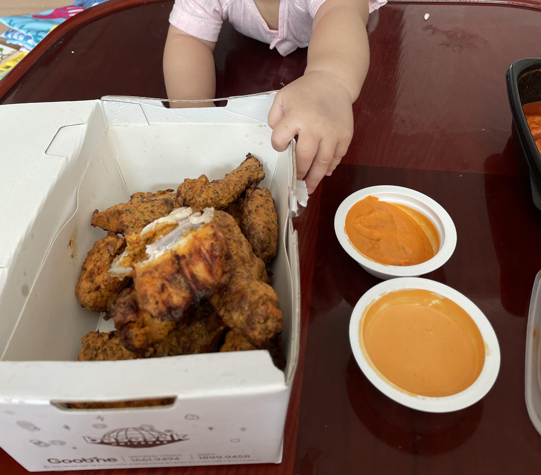 이제 슬슬 어른음식도 먹는 것이라고 인식하는지 치킨먹으려고 달려드는 우래기보소.