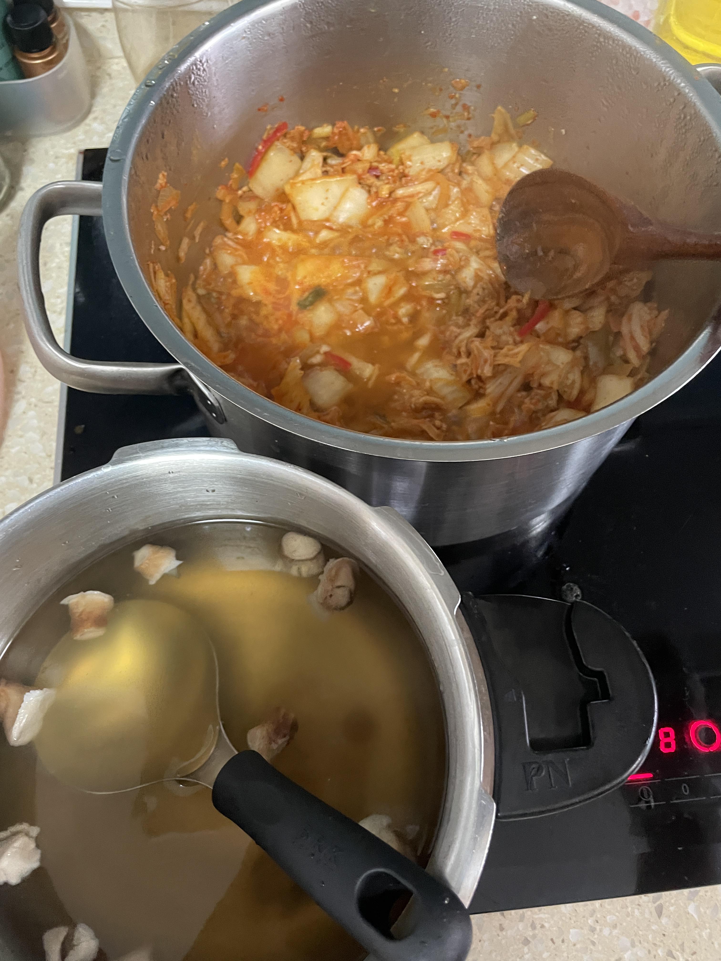 아빠씨와 내가 빨간 김치를 오히려 더 좋아하고 김치찌개 그 빨간 국물 맛이 먹고 싶어서 ㅋㅋ 저번에는 백김치찌개와 빨간김치찌개 두개를 끓이고, 이번에는 빨간김치찌개용으로 백김치를 모두 소진했다.