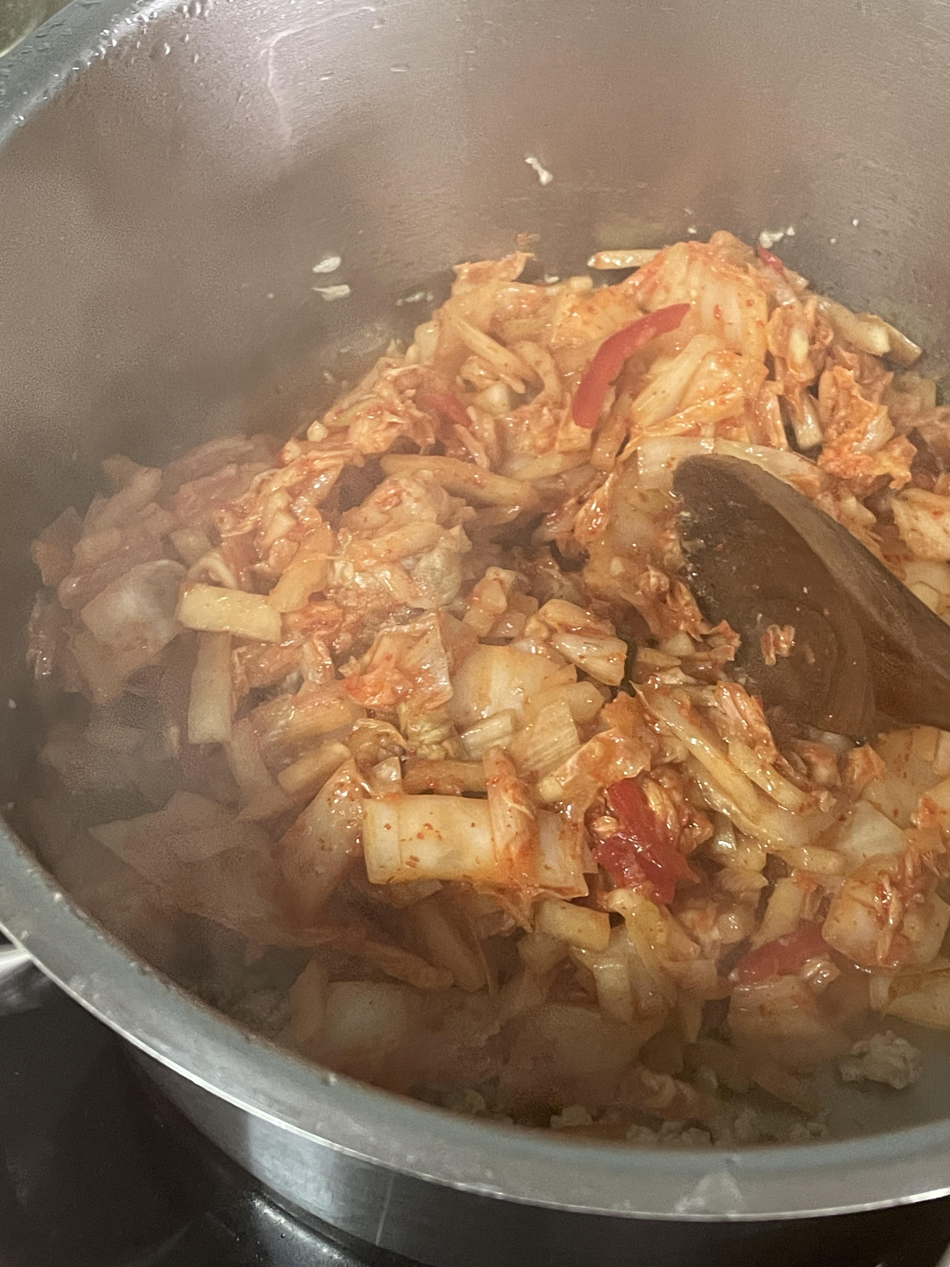 김치자체에 물기가 있어서 쉽게 타지는 않지만, 고춧가루가 들어갔기 때문에 타지 않도록 유의한다.