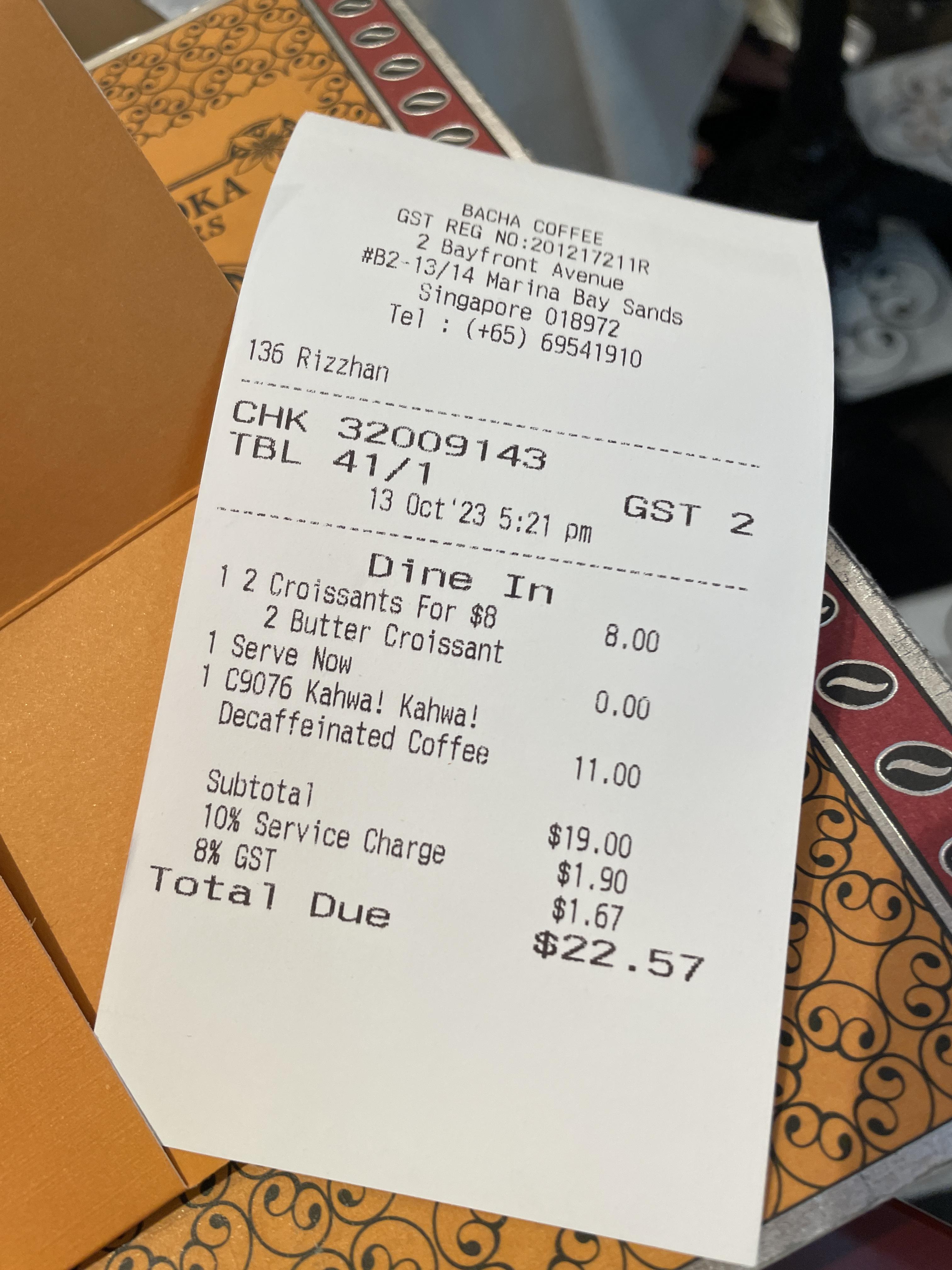 pot 하나에 크라상 두개 시켜서 gst 까지 합쳐서 23불정도 나왔다.