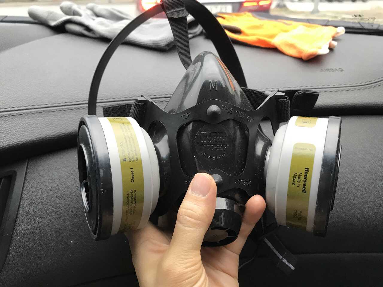 방독면. 첨에 곰팡이제거는 걍 맨얼굴로 마스크 쓰고 했는데, 마스크에 다 들어오더라는..