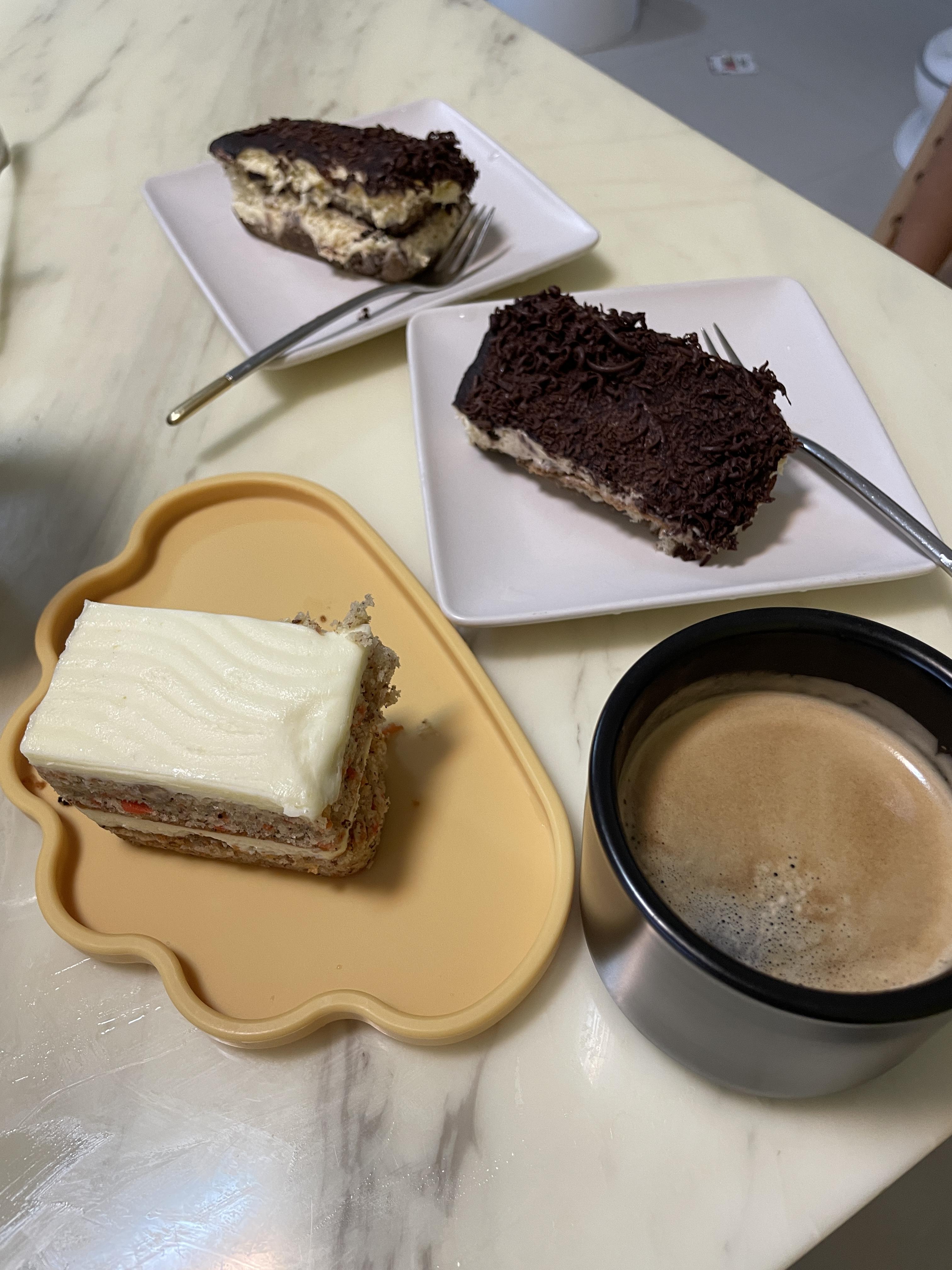 엄빠는 티라미수에 커피, 아이는 캐럿케이크에 우유.