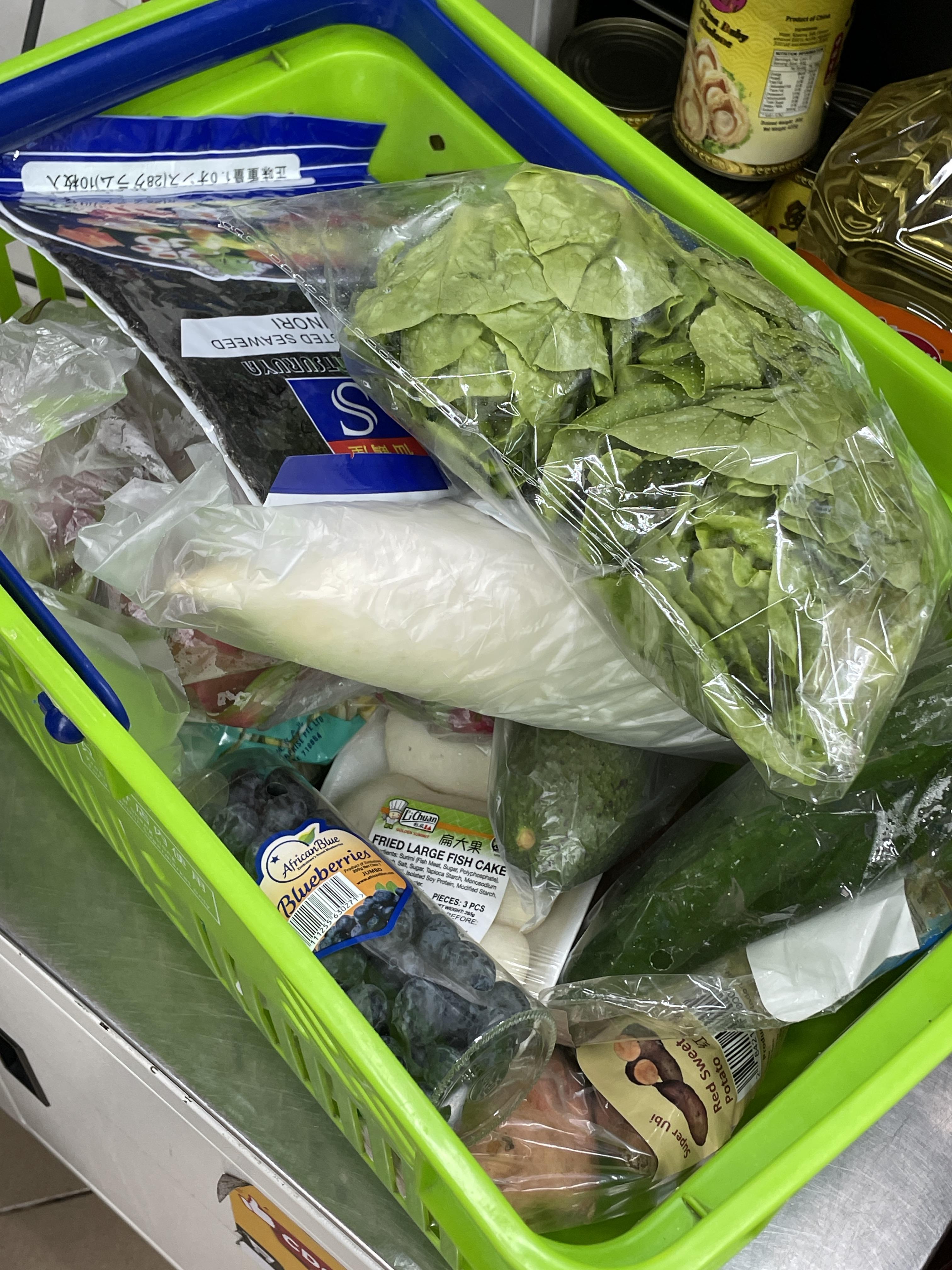 한국 김밥김이 없어서 있는 일본거 사고, 한국 오뎅도 (당연히)없어서 그냥 뭐 적당한거 사고, 아보카도, 오이, 고구마, 블루베리, 로메인, 콩나물, 무, 파프리카 등등.
