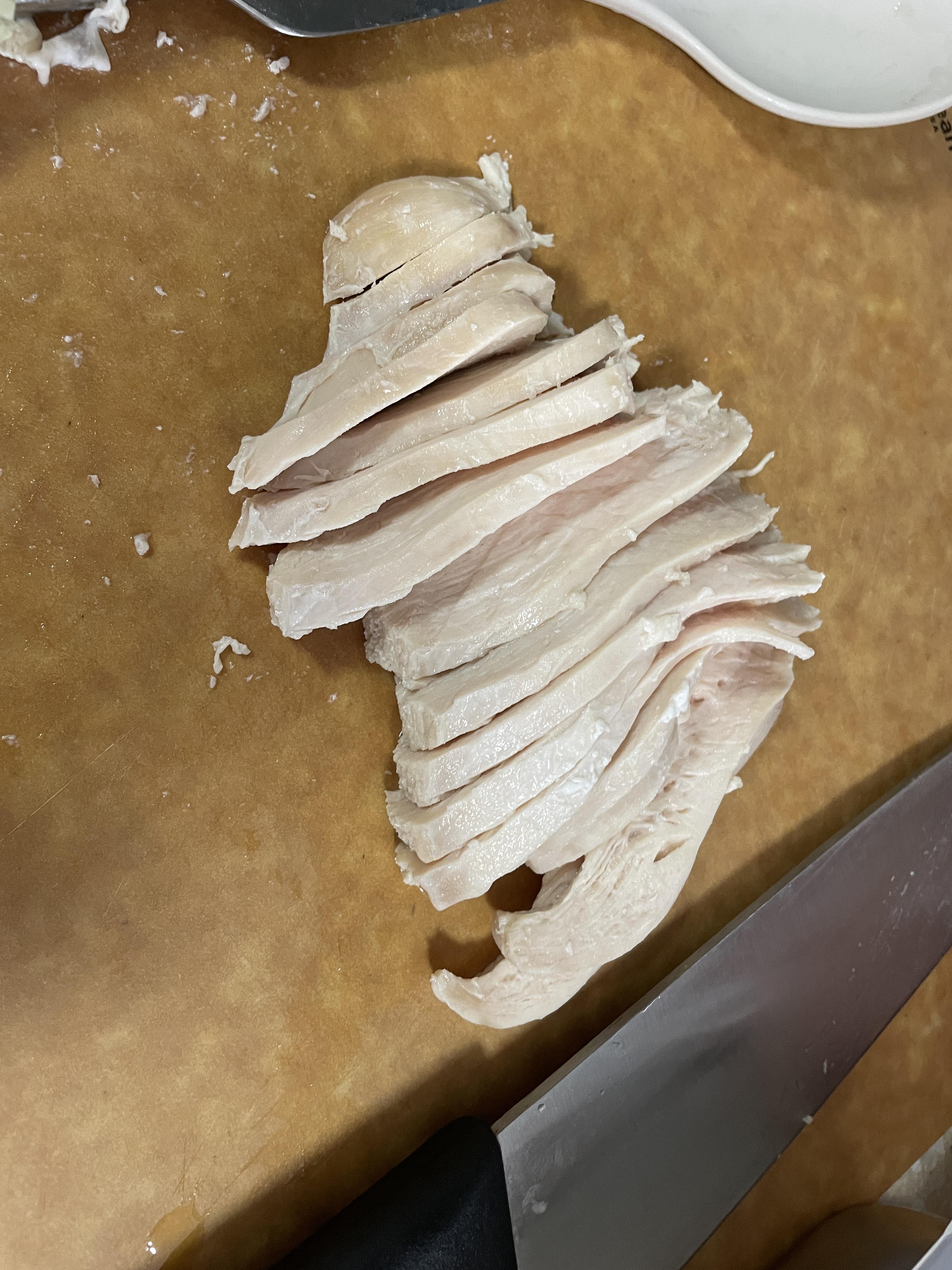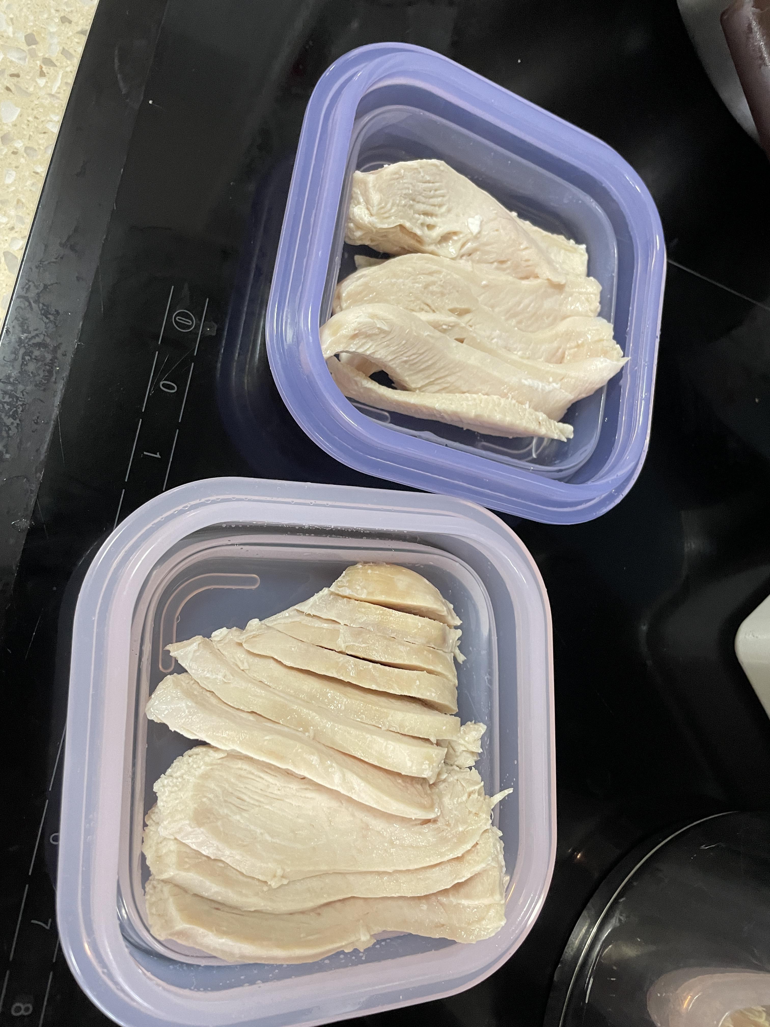 닭가슴살도 슬라이스해서 바로 뎁혀서 샐러드 올릴 수 있게 통에 소분하고, 육수 나온건 토마토소스 만들 때 넣게 한번 걸러 담아놓기.