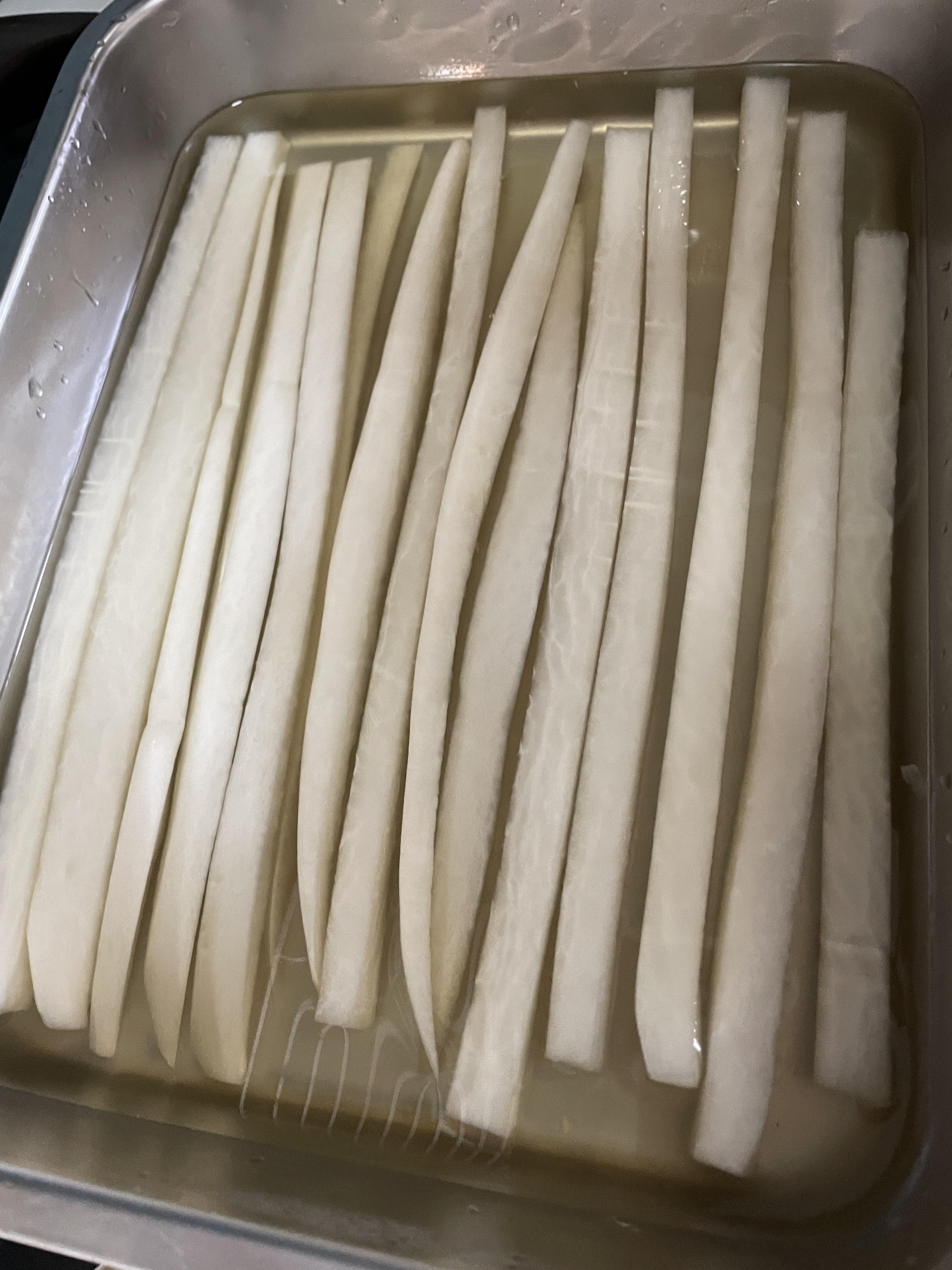 한시간즈음- 피클물이 식을때까지만 놔두다보면 무가 살짝 쪼그라들면서 맛이 든다.