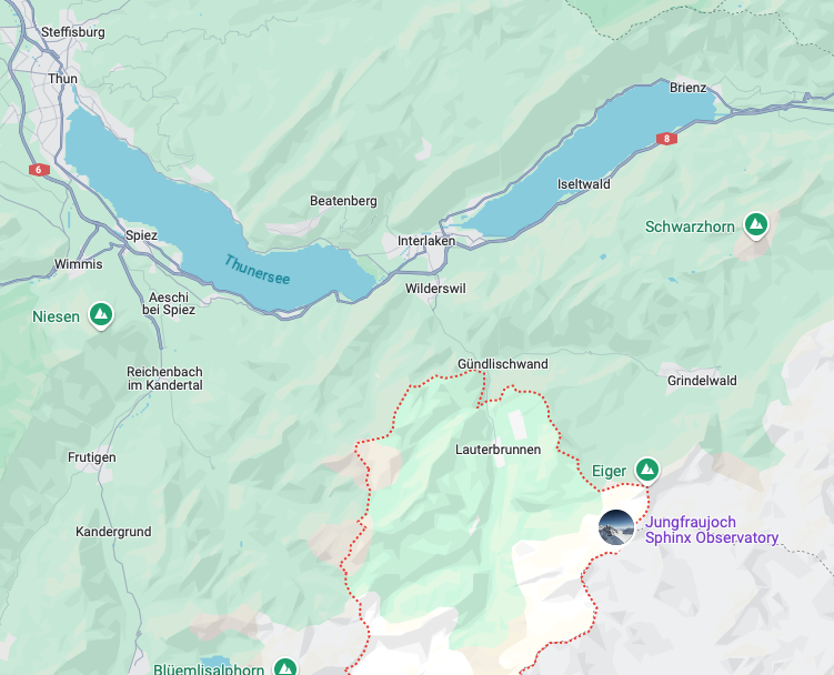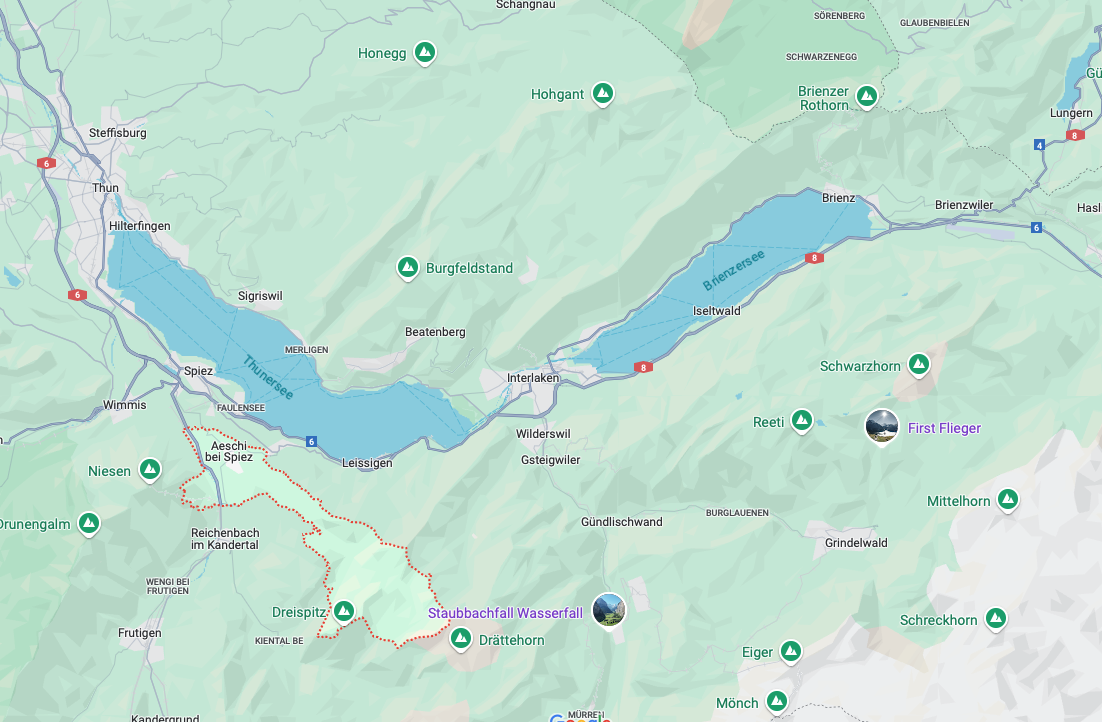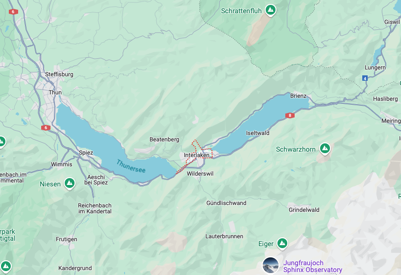 다만, 인터라켄과 조금이라도 더 멀어지면 그린델왈드를 가는 길이 너무 오래걸리기 때문에 거리를 계속 확인하다보니 선택지로 할 수 있는 곳이 별로 없었다. 그린델왈드와 40분이내이면서 베른을 당일치기로 1시간여 거리인 곳을 묵고자 했다.
