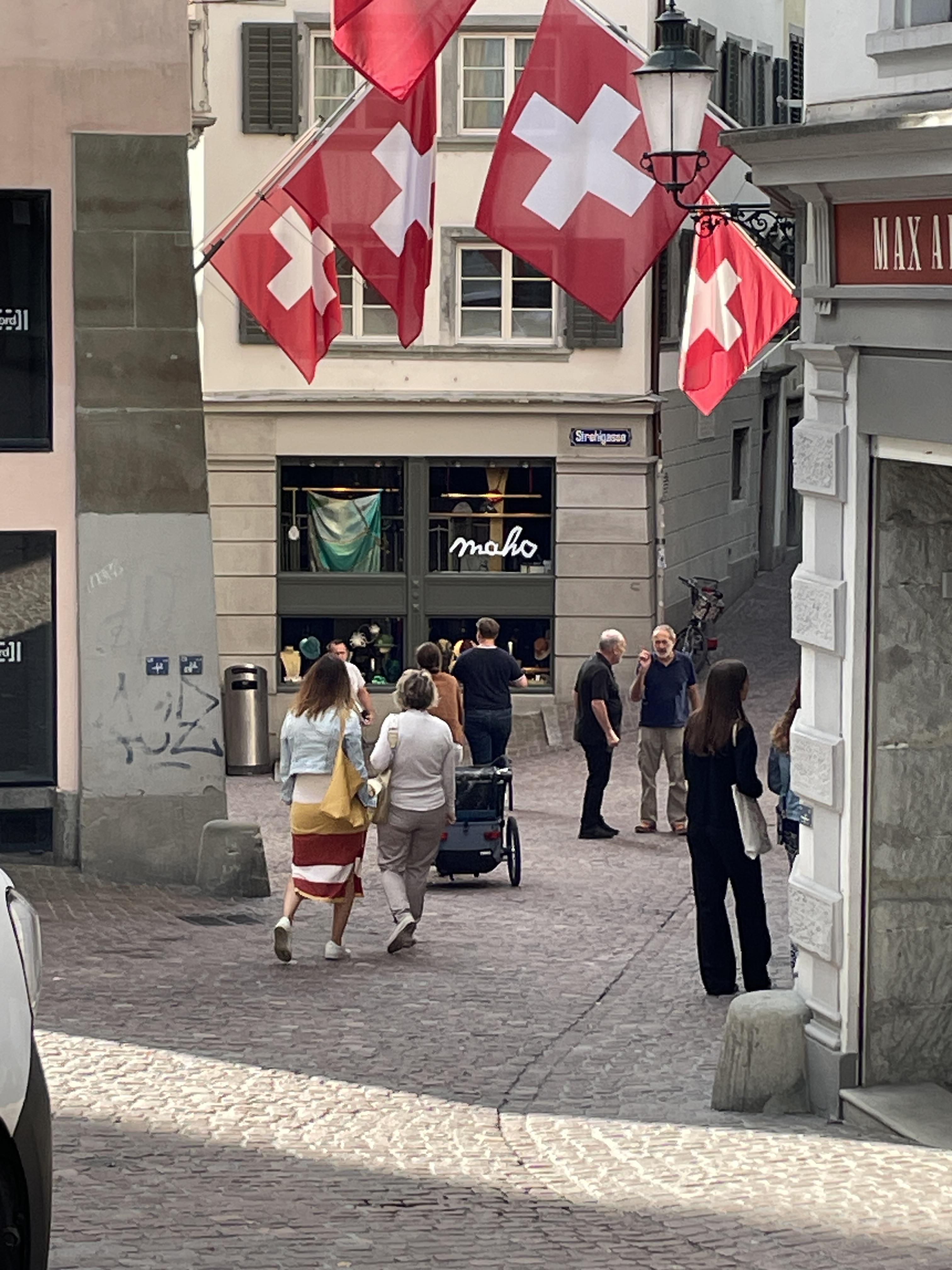 스위스 국기도 보이고, 아이데리고 프리스쿨 등원하는 것 같은 풍경도 보였다.