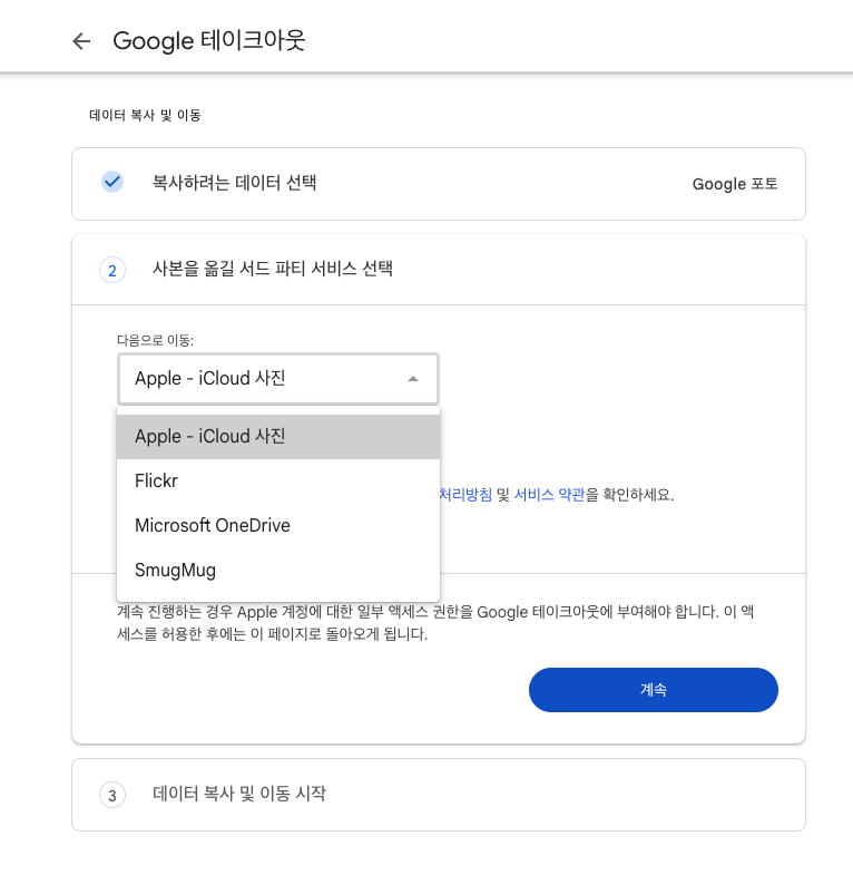 그리고 같은 테이크아웃아닙니다. 서드 파티 서비스 선택해서 데이터 복사 및 이동해주는 테이크아웃입니다. 링크의 주소가 살짝 다릅니다.